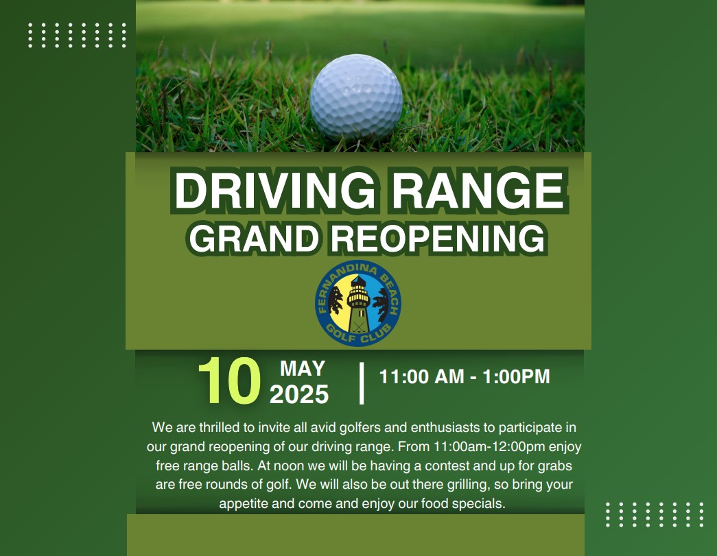 11:00 am - 1:00 pm Driving Range Grand Reopening May 10 @ 11:00 am - 1:00 pm Driving Range Grand Reopening The Fernandina Beach Golf Club is thrilled to invite all avid golfers and enthusiasts to participate in our grand reopening of our Lighthouse Driving Range. From 11:00am-1:00pm enjoy free range balls. At noon we will be having a contest and up for grabs are free rounds of golf. We will also be out there grilling, […]
