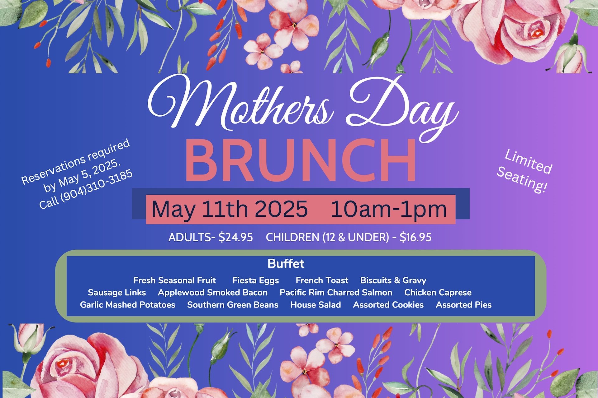 10:00 am - 1:00 pm Mother’s Day Brunch May 11 @ 10:00 am - 1:00 pm Mother’s Day Brunch Come enjoy a special Mother's Day brunch at Fernandina Golf Club from 10am - 1pm.