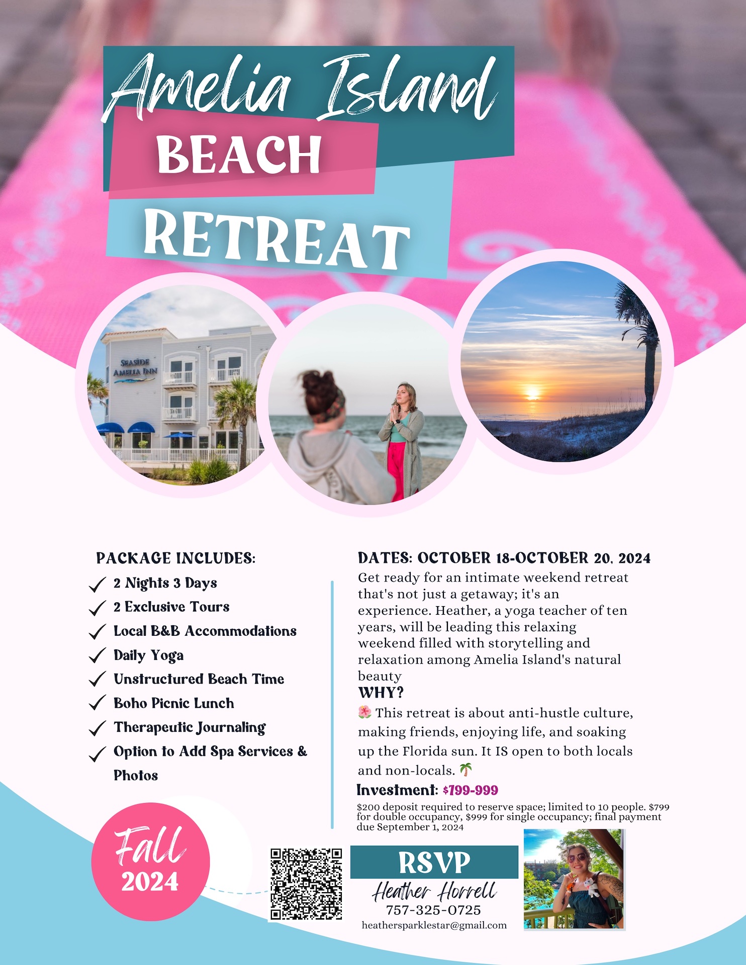9:00 am - 5:00 pm Event Series Beach Bliss Amelia Island Retreat October 20, 2024 @ 9:00 am - 5:00 pm Event Series Beach Bliss Amelia Island Retreat Join us for an unforgettable LOCAL weekend escape to the enchanting shores of Amelia Island! Immerse yourself in beachside yoga, indulge in boho-chic picnics, and explore the heart of downtown with sips and bites. Kayak through nature's wonders and unwind in charming accommodations. It's not just a retreat; it's an experience! The mission is relaxation! […]