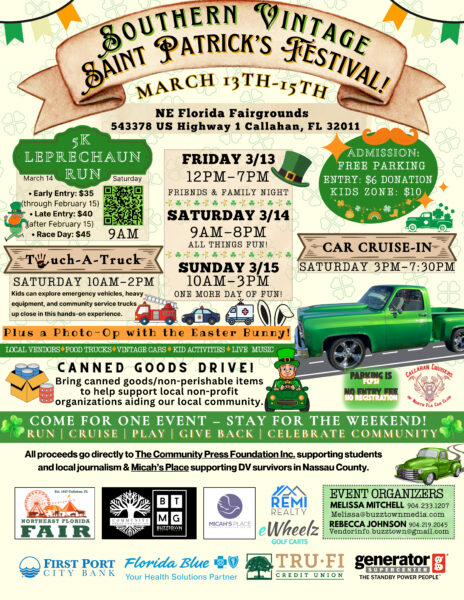 Colorful poster for the Southern Vintage Saint Patrick’s Festival, March 13-15 at NE Florida Fairgrounds. Includes event schedule, car show, food trucks, 5K, canned goods drive, and sponsor logos with green and festive graphics.