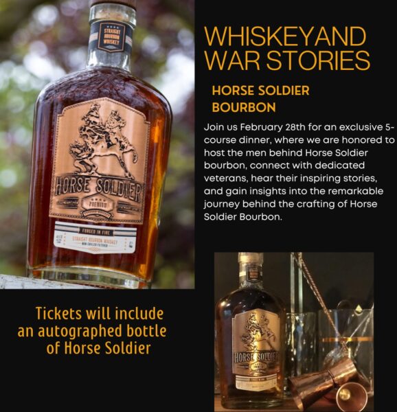 Immerse yourself in the captivating tales of veterans while sipping on the finest selection of Horse Soldier bourbon, paired with innovative cuisine to bring out its delicious flavors. This event is sure to leave you inspired and entertained.