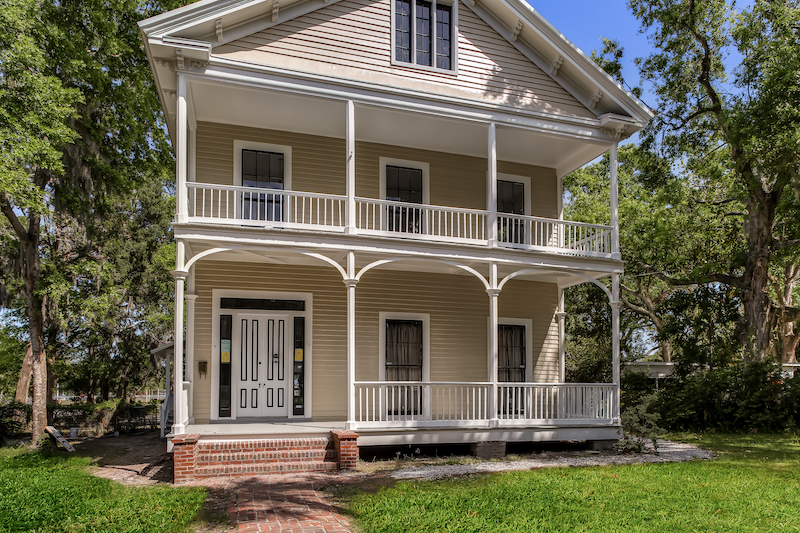 This Greek Revival Style house is one of the last remaining pre-Civil War houses in Fernandina’s Historic District. It once belonged to Chloe Merrick, an agent of the National Freedmen’s Association from Syracuse. Merrick helped establish a Freedman’s School to educate formerly enslaved people and served African American orphans before and after the Civil War. This home was later purchased by John Simmons who owned the island’s ice plant and the long defunct trolley that ran from downtown to the beach. 102 South 10th St, Fernandina Beach
