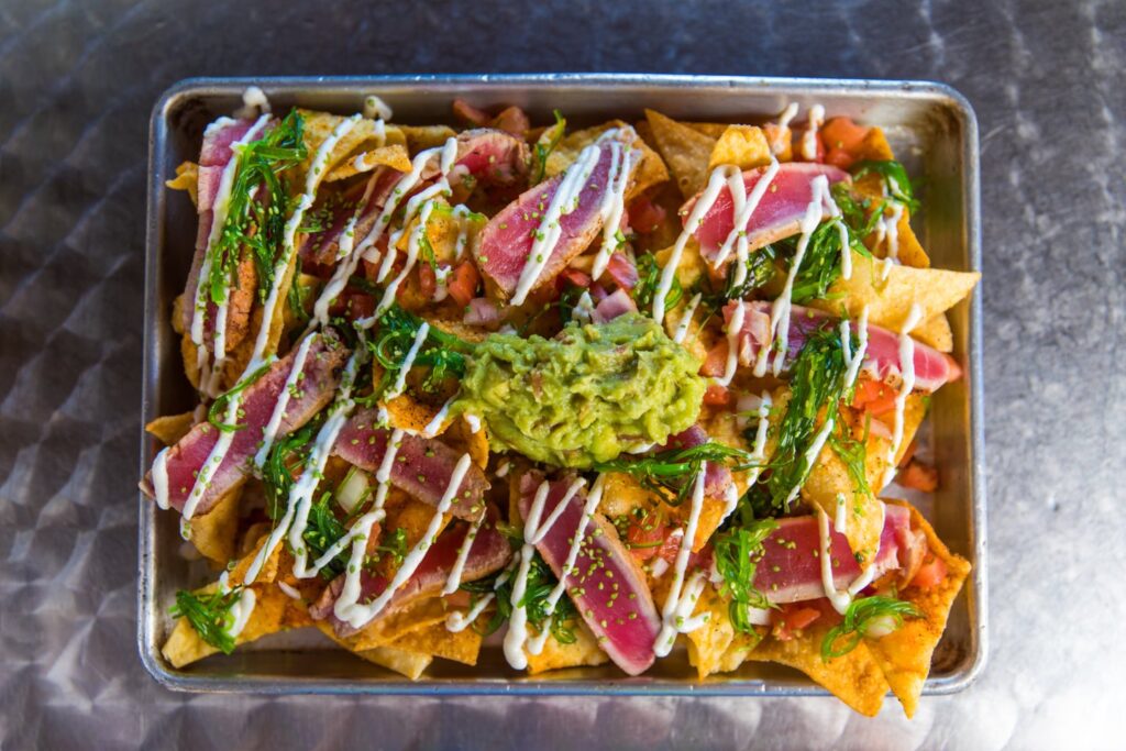 For a unique and fresh take on nachos, try the Tuna Nachos at Salty Pelican. Seared tuna is served over blackened wonton chips with seaweed salad, goat cheese, pico de gallo, and wasabi sesame seeds. Order this appetizer. Trust me.