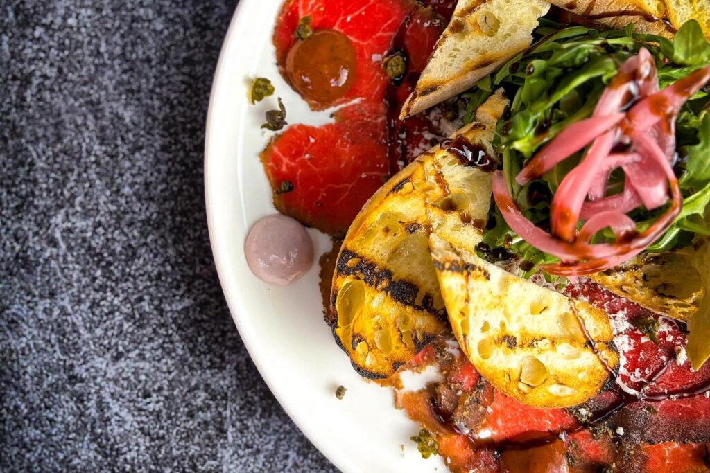 Treat yourself to this luxurious Wagyu Beef Carpaccio, served thinly sliced with fresh garnish, olive oil, crunchy toast, and other sophisticated touches. Perfect for meat lovers looking for a light starter that melts in your mouth and is oh-so decadent.
