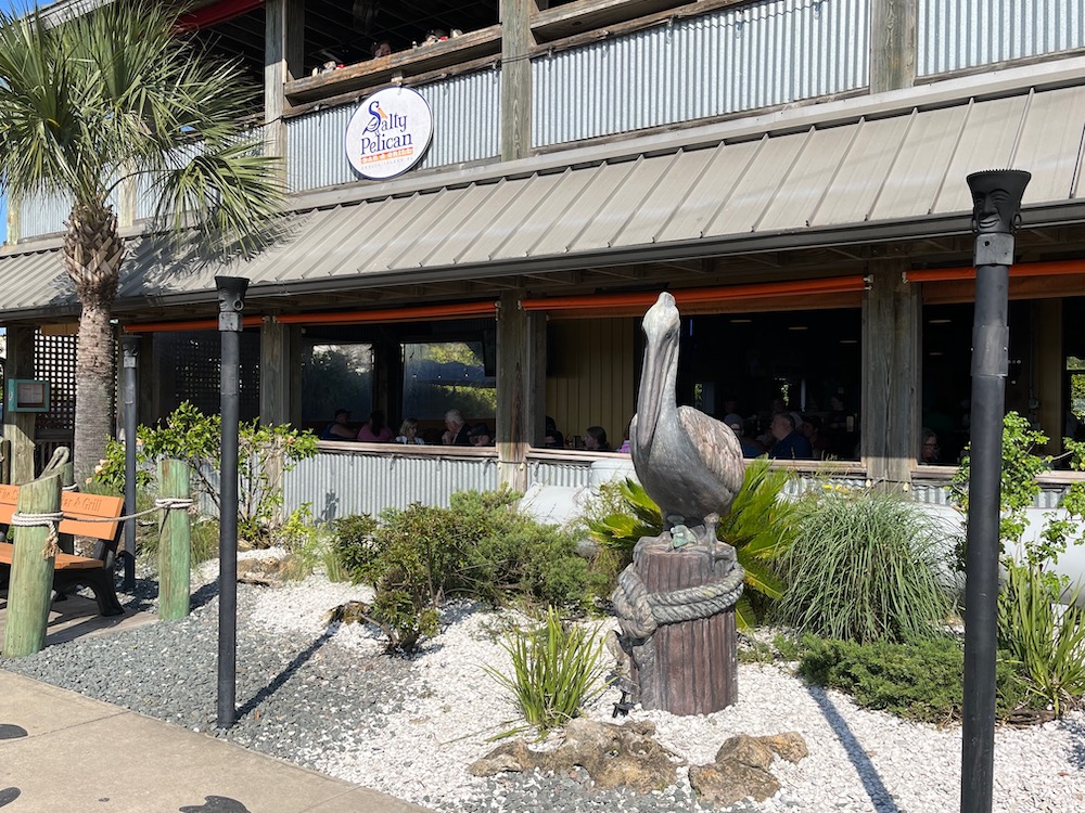 Salty Pelican Bar & Grill is a popular downtown dining spot to enjoy good food, tasty cocktails and amazing sunsets over the river. However, sitting squarely in the middle of the entrance is the mascot for whom the restaurant is named. Yep, this pelican has worn beads, boas, hats and scarves depending on the season, and is always ready for a party.