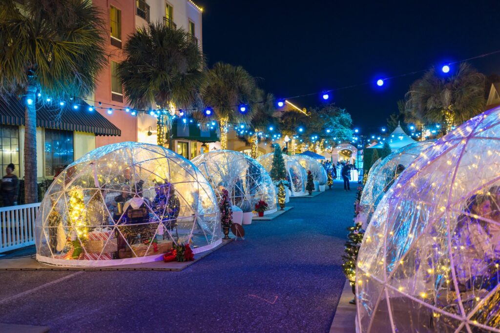 Visit Tiny Tim’s Kid Zone for family-friendly fun, including kids’ activities, outdoor holiday movies, face painting, and a photo op with St. Nick himself.