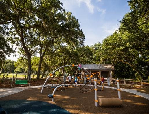 This playground, set in a breezy, shaded area amongst the trees is like nothing our region has seen before. The community-accessible playground integrates exercise, art, nature, music, imagination, and local history for children of all physical and mental abilities.